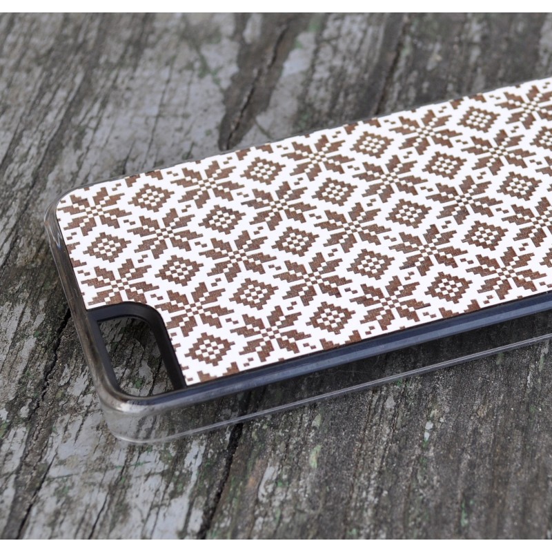 „Etno II“ dėklas pagamintas iš 100% natūralaus medžio ir juodo matinio plastiko. Paveiksliukas yra išgraviruotas ant baltai dažyto alksnio, kuris pasižymi itin geromis graviravimo savybėmis – garantuojamas ryškus vaizdas. Medinis dėklas pažadins jūsų pojūčius ir nustebins tikru medžio aromatu. Toks dėklas sujungia modernų meną su nesenstančia klasika, kad jūsų telefonas atrodytų originaliai, moderniai ir kartu prabangiai.
