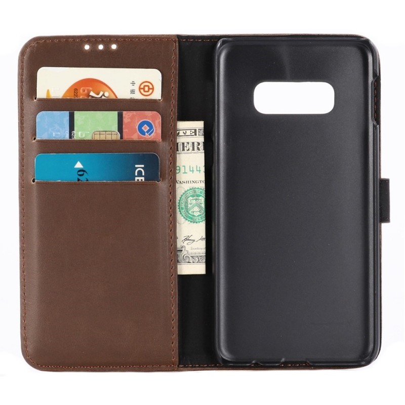 Samsung Galaxy S10e (G970) atverčiamas tamsiai rudas odinis retro dėklas - piniginė / Priedai.lt