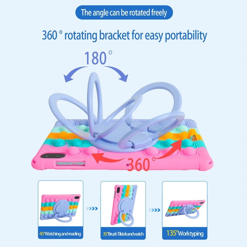 „Popit“ Bubble Kickstand sērijas apvalks, ar virsmu, kas pārklāta ar daudziem paceltiem burbuļiem. Šis gadījums ir īpašs ar to, ka uz ķermeņa virsmas var spēlēt izglītojošu spēli, kas veicina bērna intelekta izaugsmi.