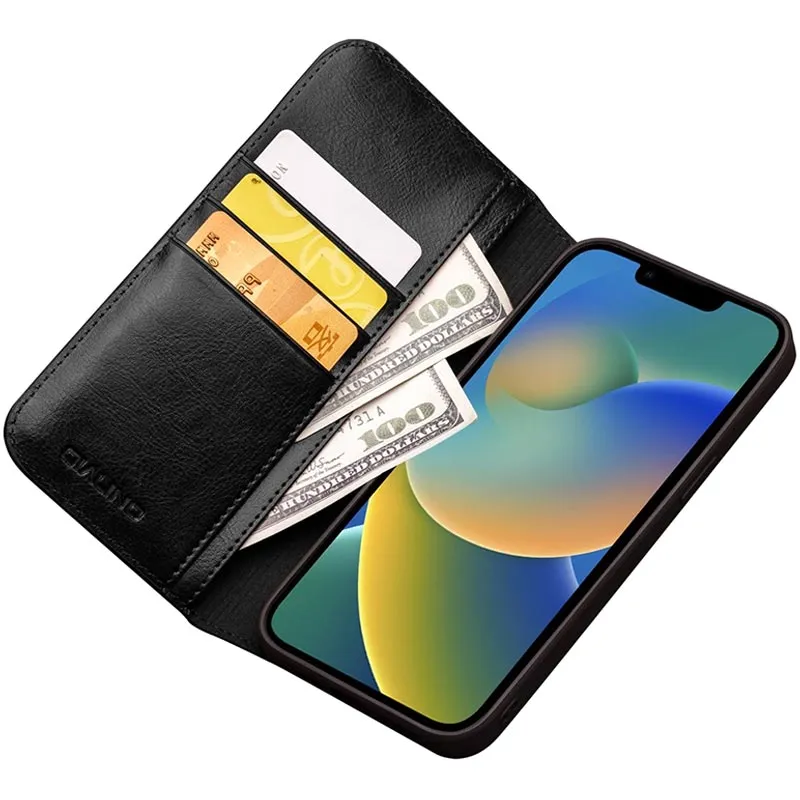 Apple iPhone 14 „QIALINO“ atvēramais ādas melns maciņš - maks | Vacins.lv