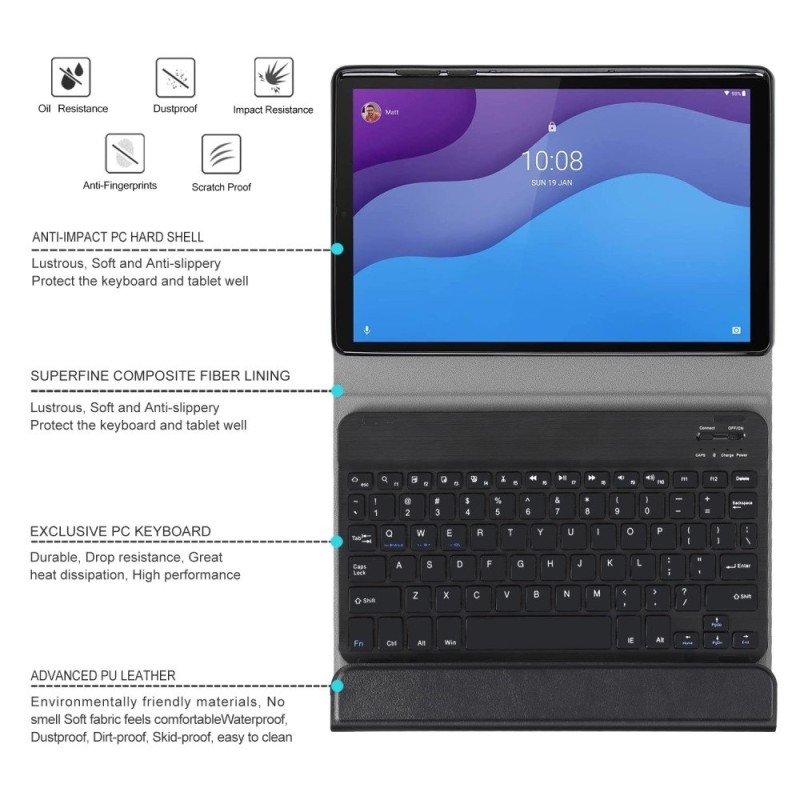 - Maciņā ir iebūvēta Bluetooth bezvadu tastatūra ar uzlādējamo litija jonu akumulatoru,