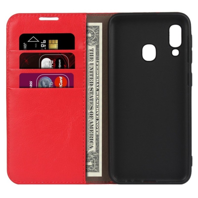 Samsung Galaxy A20e (A202F) atvēramais ādas sarkans maciņš (maks) / Vacins.lv